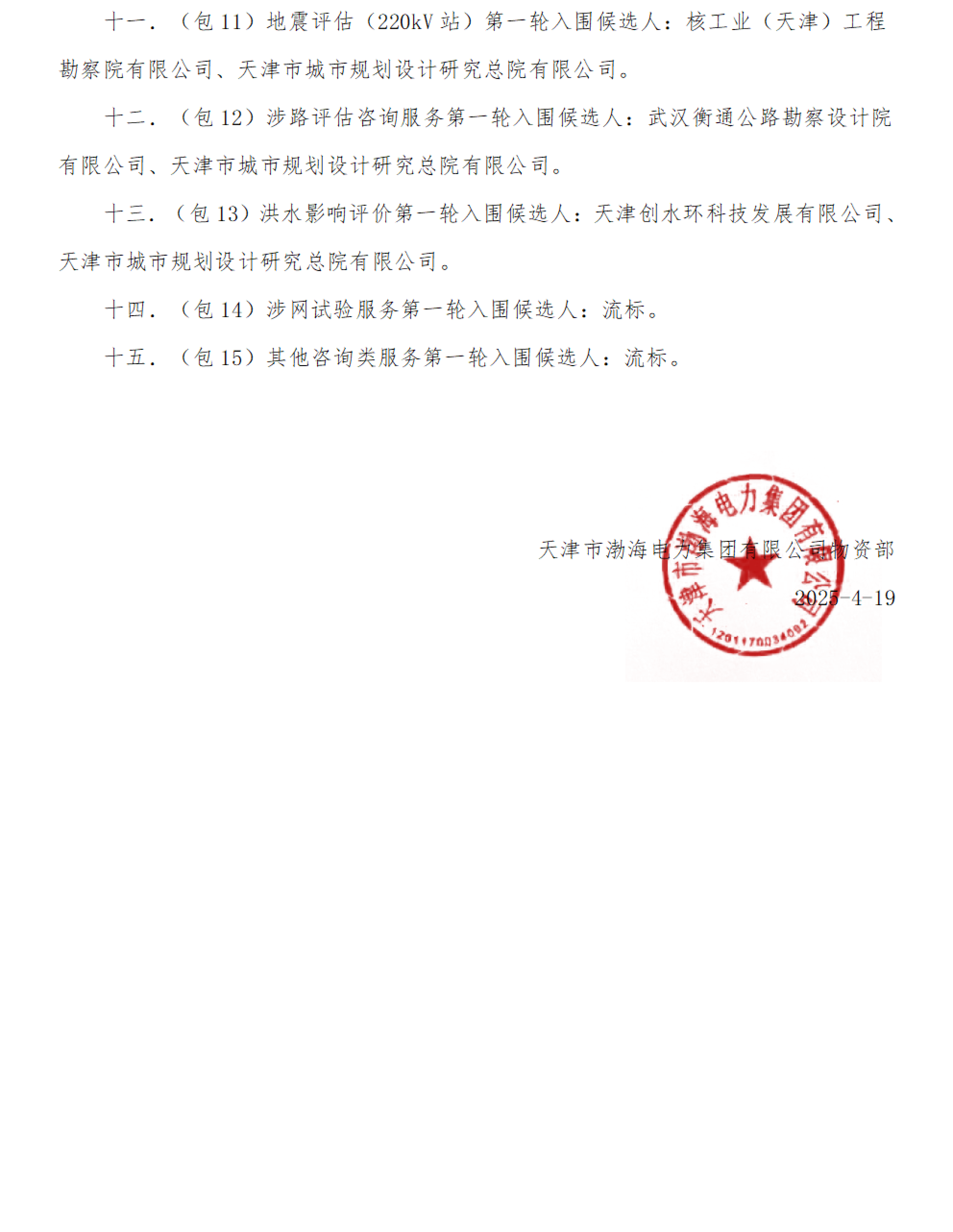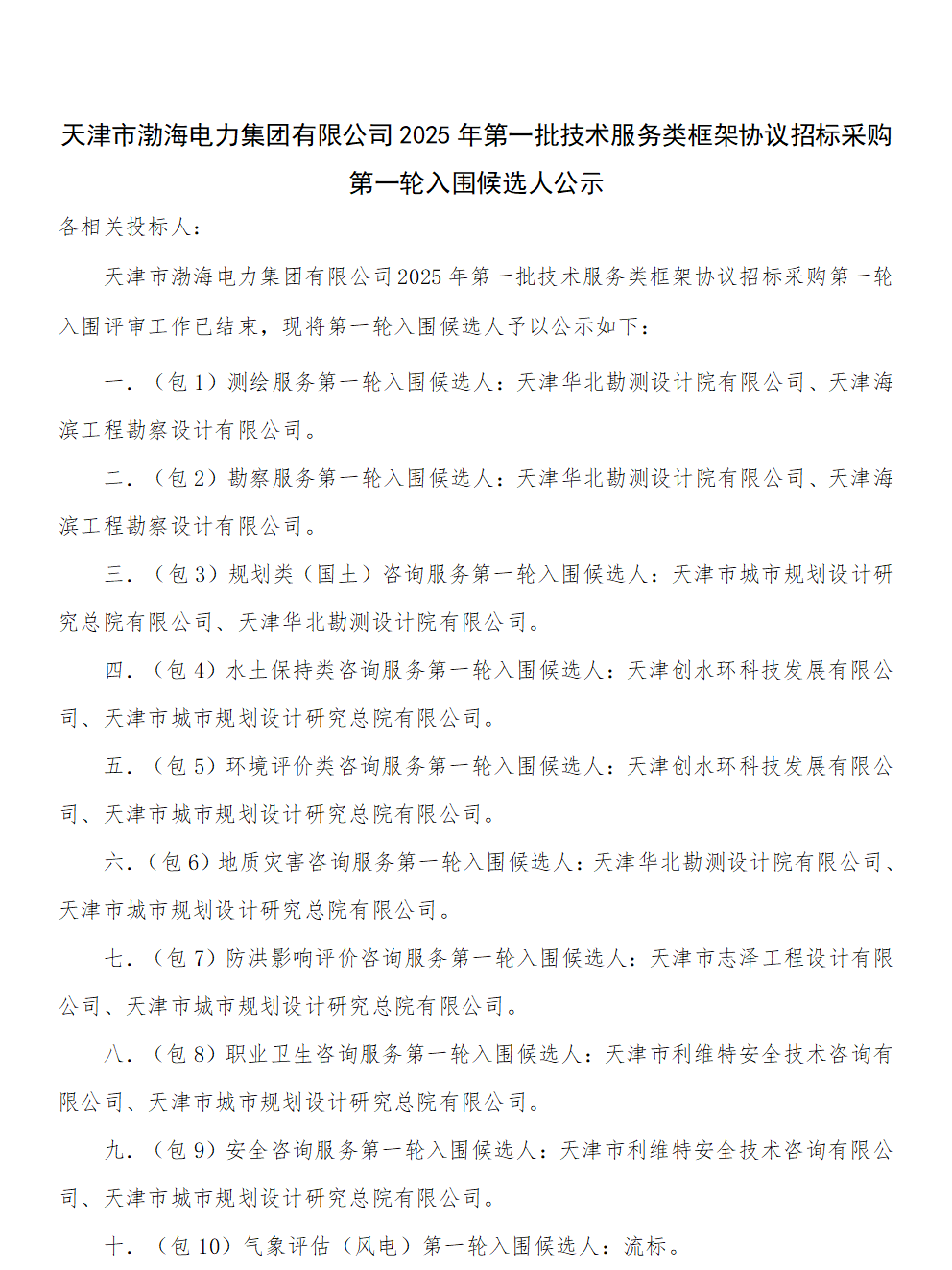 天津市渤海电力集团有限公司2025年第一批技术服务类框架协议招标采购第一轮入围候选人公示